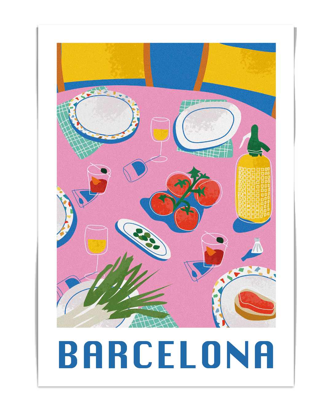 Succombez à l'ambiance de Barcelone avec cette illustration colorée de tapas, vermut et olives. Un hommage à la convivialité espagnole, où chaque moment se savoure !